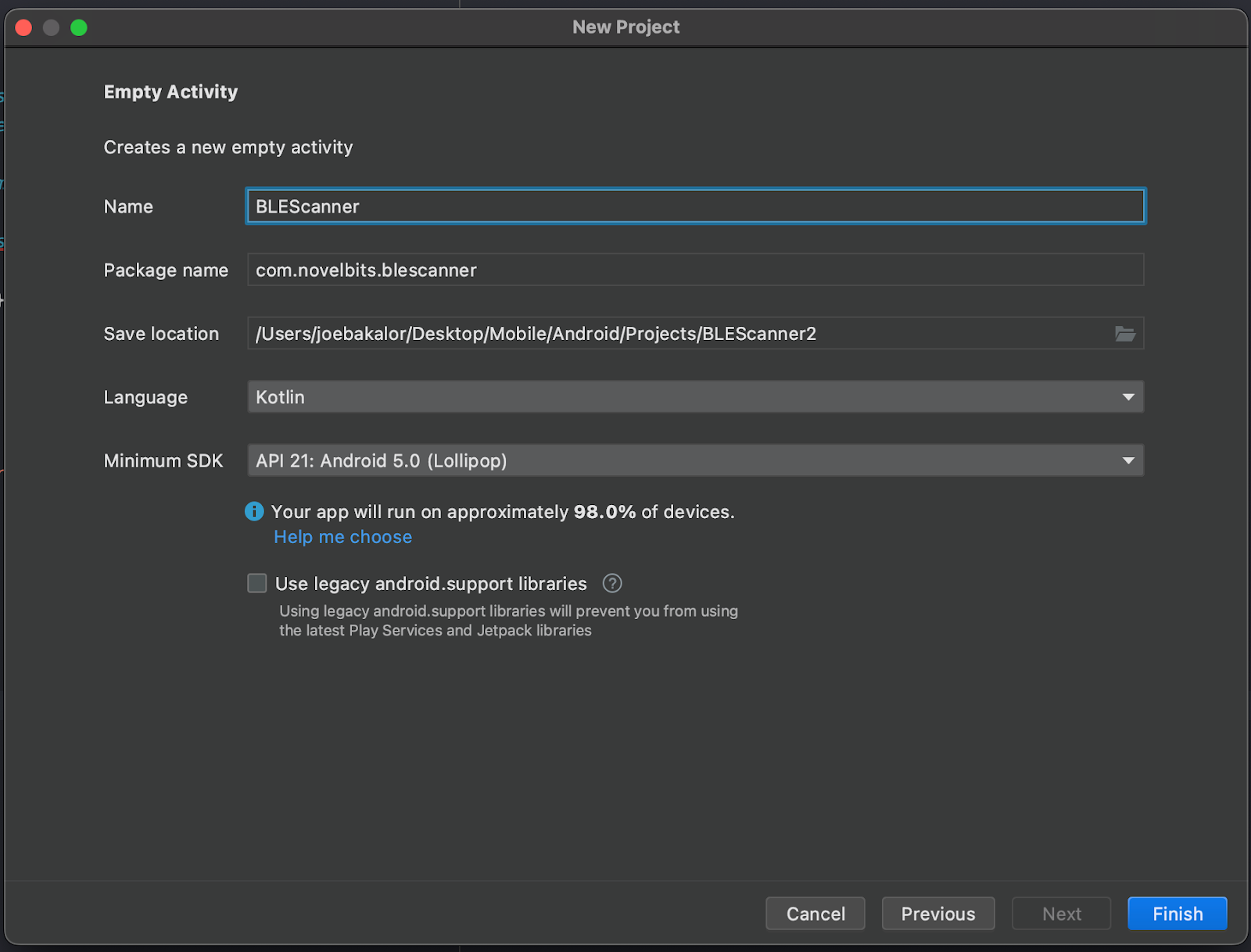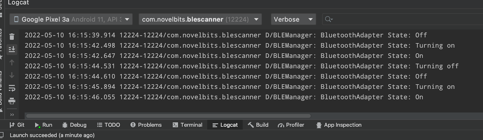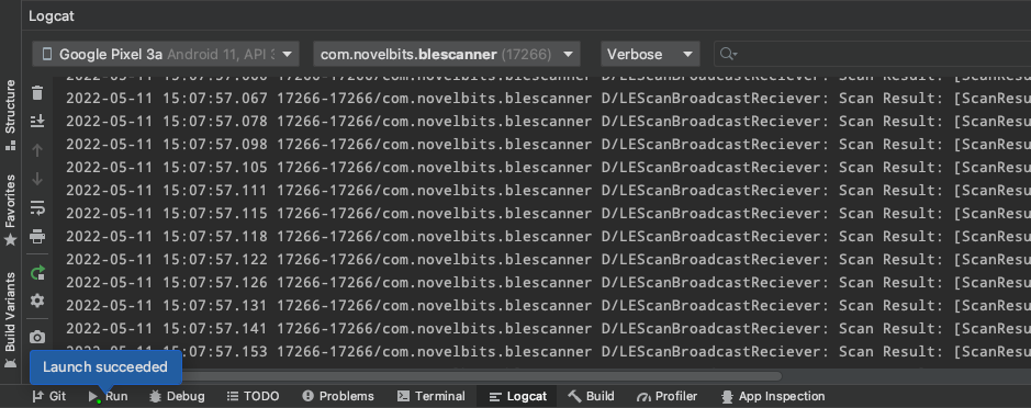 In this tutorial, we covered everything required to get an Android application set up with the correct permissions and begin scanning for Bluetooth Low Energy devices.