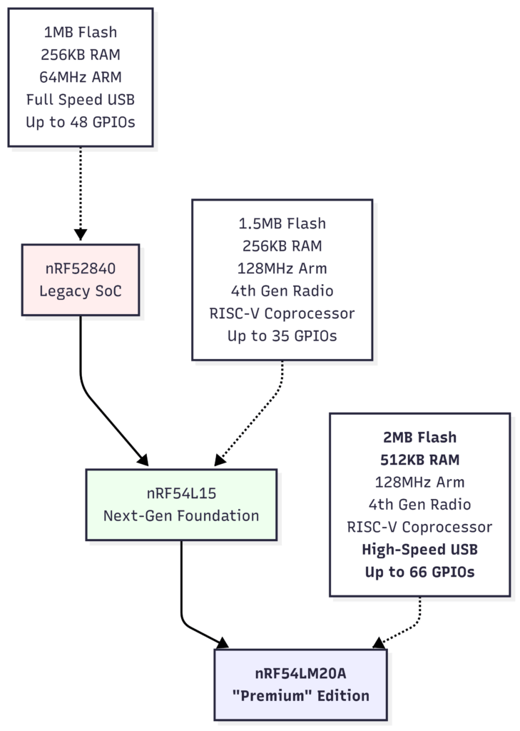 Now, Nordic has expanded their offering with the nRF54LM20A—the bigger sibling to the nRF54L15 that takes everything up a notch. Think of it as the "premium edition" of the lineup. While the nRF54L15 established Nordic's new direction with its 22nm process and higher power-efficiency design, the nRF54LM20A represents what happens when you remove the constraints and build for developers who need maximum capability.